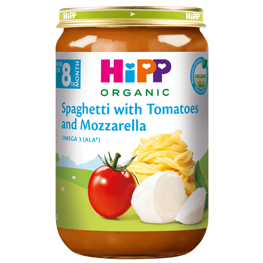 HiPP Шпагети со домати и моцарела, како целосен оброк